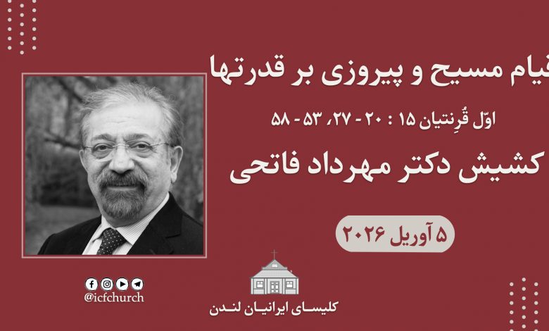 خانه/موعظهها/قیام مسیح و پیروزی بر قدرتها موعظهها قیام مسیح و پیروزی بر قدرتها کشیش دکتر مهرداد فاتحی ارسال ایمیل 4 ساعت پیش۰ 7,521 کمتر از یک دقیقه https://icfonline.co.uk/wp-content/uploads/sermons/2026/Rev%20Dr%20Mehrdad05-04-26.mp3 دانلود فایل صوتی قیام مسیح و پیروزی بر قدرتها اول قرنتیان ۱۵: ۲۰-۲۷ اول قرنتیان ۱۵: ۵۳-۵۸ کشیش دکتر مهرداد فاتحی کشیش دکتر مهرداد فاتحی ارسال ایمیل 4 ساعت پیش۰ 7,521 کمتر از یک دقیقه نمایش بیشتر اشتراک گذاری فیس بوک توییتر لینکدین اسکایپ واتس آپ تلگرام اشتراک گذاری از طریق ایمیل چاپ